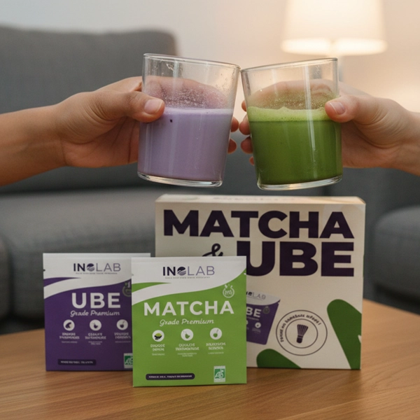 Le matcha et l’ube ne se ressemblent pas : ils s’assemblent. Le matcha apporte une énergie mentale douce (caféine + L-théanine), parfaite au réveil, tandis que l’ube offre une énergie progressive et apaisante, idéale l’après-midi. Leur duo crée un équilibre naturel : stimuler sans stresser, apaiser sans endormir. Vert + violet, énergie + douceur : un combo aussi cohérent pour votre corps et votre esprit, que délicieux au quotidien.